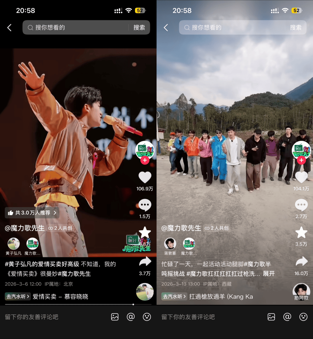 概念是先行的、音乐落地上也基本在线,市场反馈究竟如何?开播三周,官抖点赞破百万的只有黄子弘凡改编版的《爱情买卖》、和蒋敦豪携十个勤天拍摄的《扛过抢 放过羊》舞蹈,很明显明星效应仍然占据首位;从初舞台来看,网络神曲的“再加工”并未在更大市场掀起关注,换言之仍未走出以往音综舞台演唱网络神曲之后的传播困境。